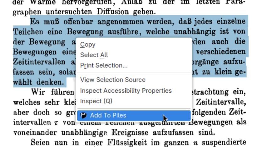 While reading a paper, you spot a passage that piques your interest. Highlight it, then either click “Add to Piles” from the browser context menu or press your custom keyboard shortcut. The snippet is stored immediately - there’s no pop‑up, no confirmation, no additional clicks.